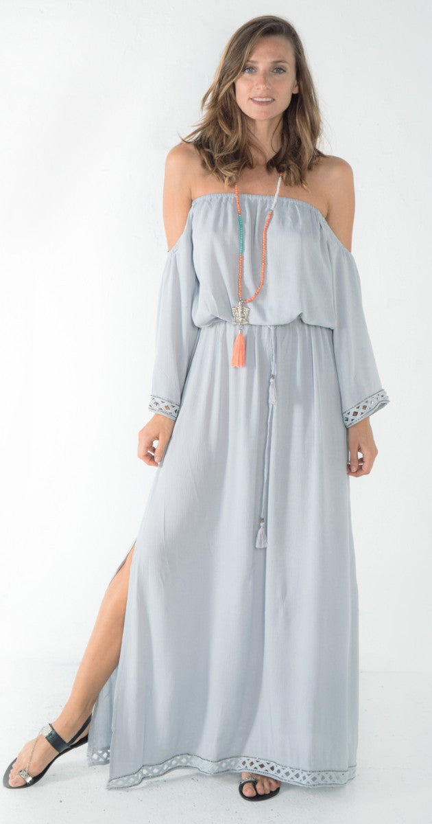 Wunderschöne, raffinierte Spitzen-Details an Ärmeln und Saum machen weiteres Styling überflüssig. Aus weichestem Rayon gefertigt, mit freien Schultern, Hals und Rücken, verfügt es auch über Schlitze an den Seiten und einen Fransengürtel, um die Taille zu betonen.