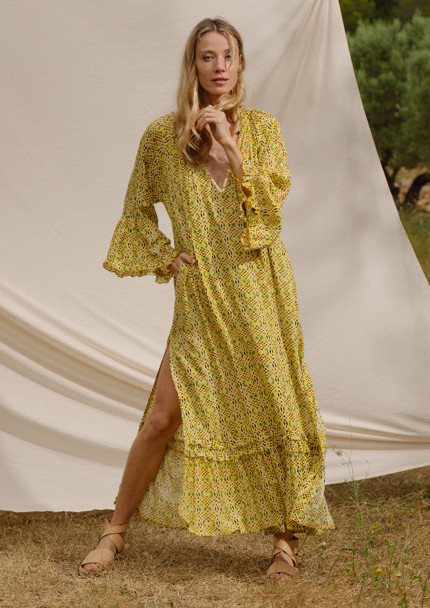 Crafted with meticulous attention to detail, this Kaftan embraces the bohemian aesthetic with its flowing silhouette and effortless charm. The wide opening at the leg creates a sense of movement and adds a touch of allure, allowing you to showcase a glimpse of skin as you walk or dance.