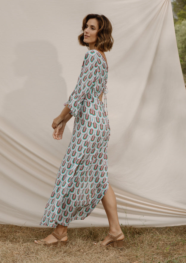 Crafted from high-quality materials and expertly tailored, our Harper dress is designed to highlight your curves and create a sleek and sophisticated silhouette. The back neckline is tied at the waist and center part, creating a sexy and alluring look that is sure to turn heads. Crafted from soft, lightweight rayon voile.