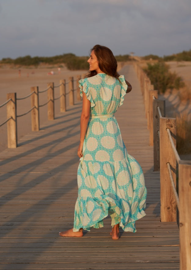 This vintage Hippy Chick Ibiza silhouette is flattering, versatile, and effortlessly beautiful it’s the perfect day to night dress. Featuring a tight wrap around bodice and a relaxed floor length skirt with ruffed hems in exquisite hues of Mediterranean Sea blue.