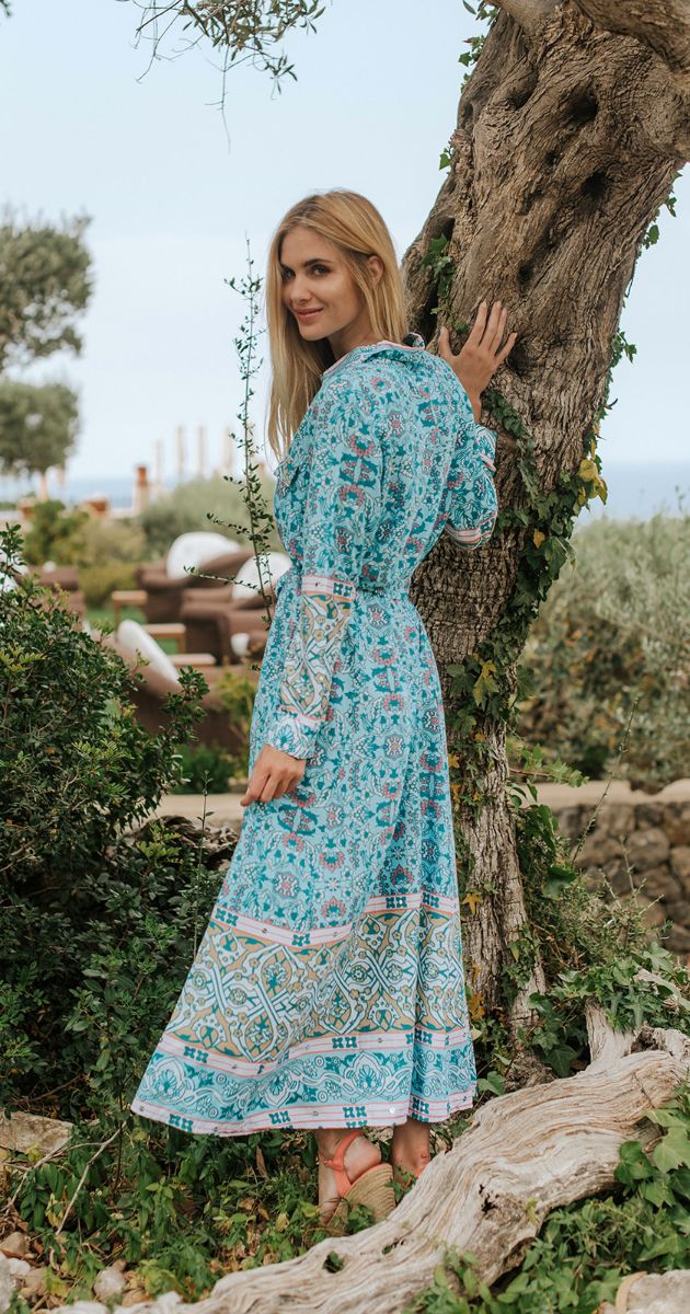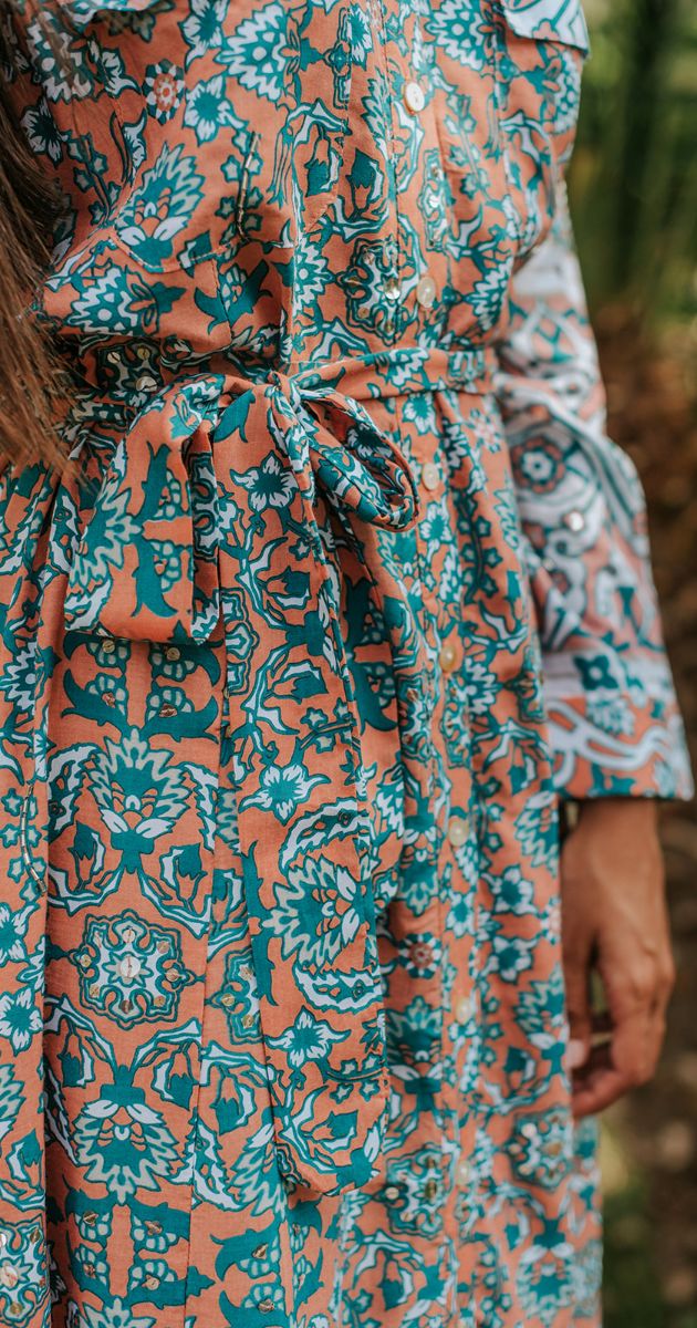 Country Glam style Melea long dress is a bit of an oddball creation. This blouse-type dress with buttons on the front runs down to the hip where a belt strip ties around the waist to ensure the most flattering fit. The flamboyant printed fabric really gives this a very special casual Hippy Chic look.