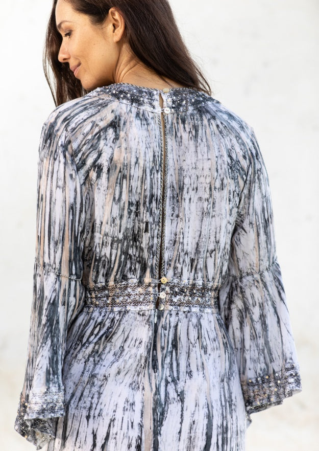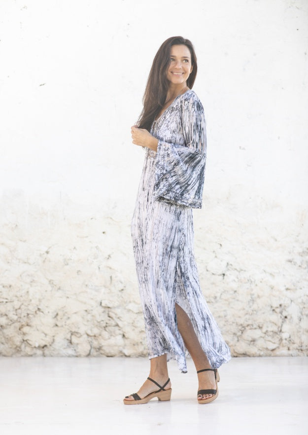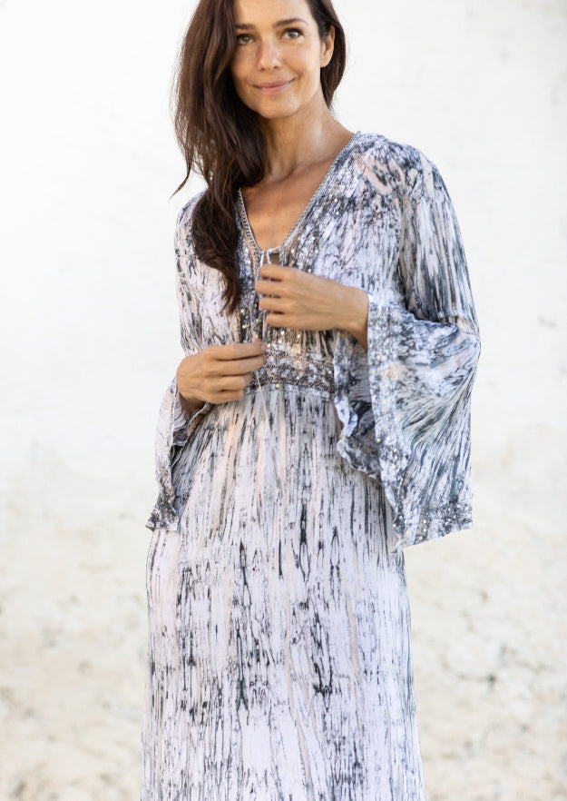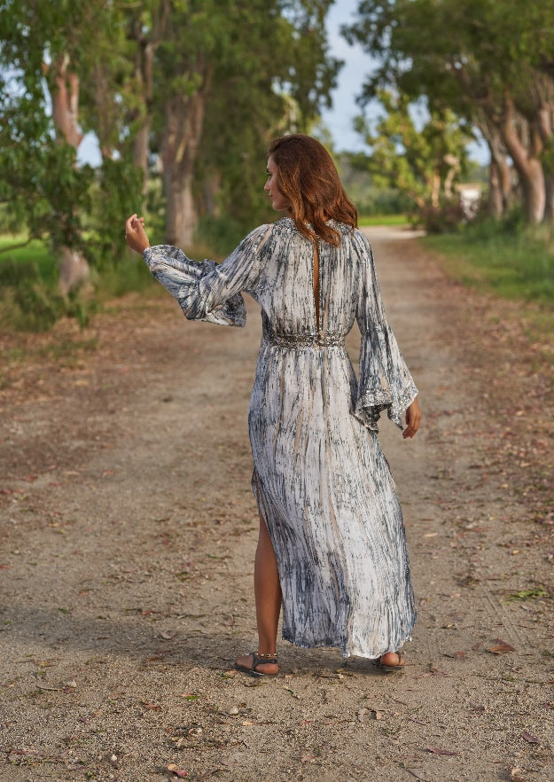 Un clásico Hippy Chick, el Cora Kaftan contiene muchos accesorios sofisticados alrededor del cuello, cintura y mangas. Con las mangas acampanadas este vestido es una verdadera poesía al espíritu ibicenco.