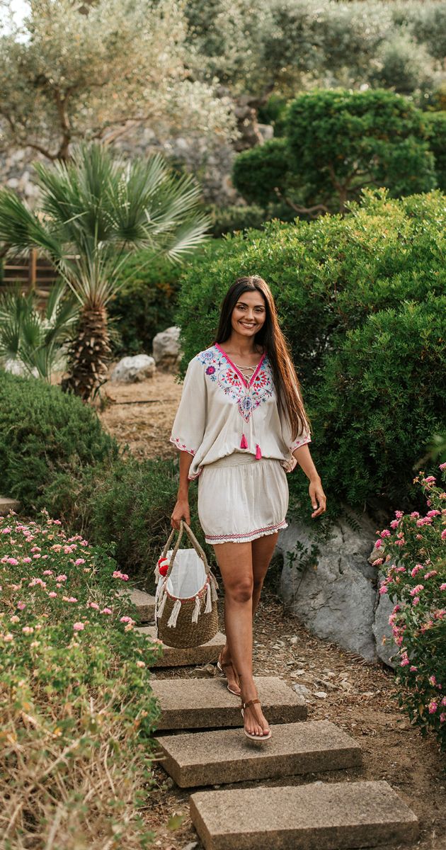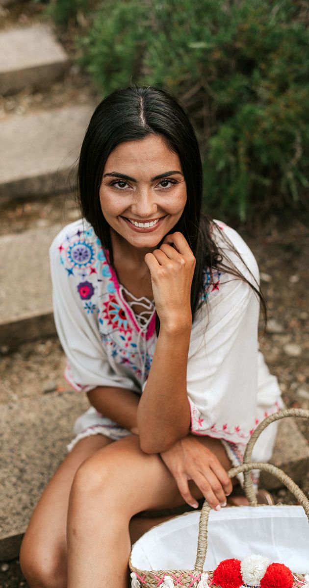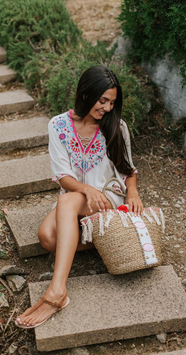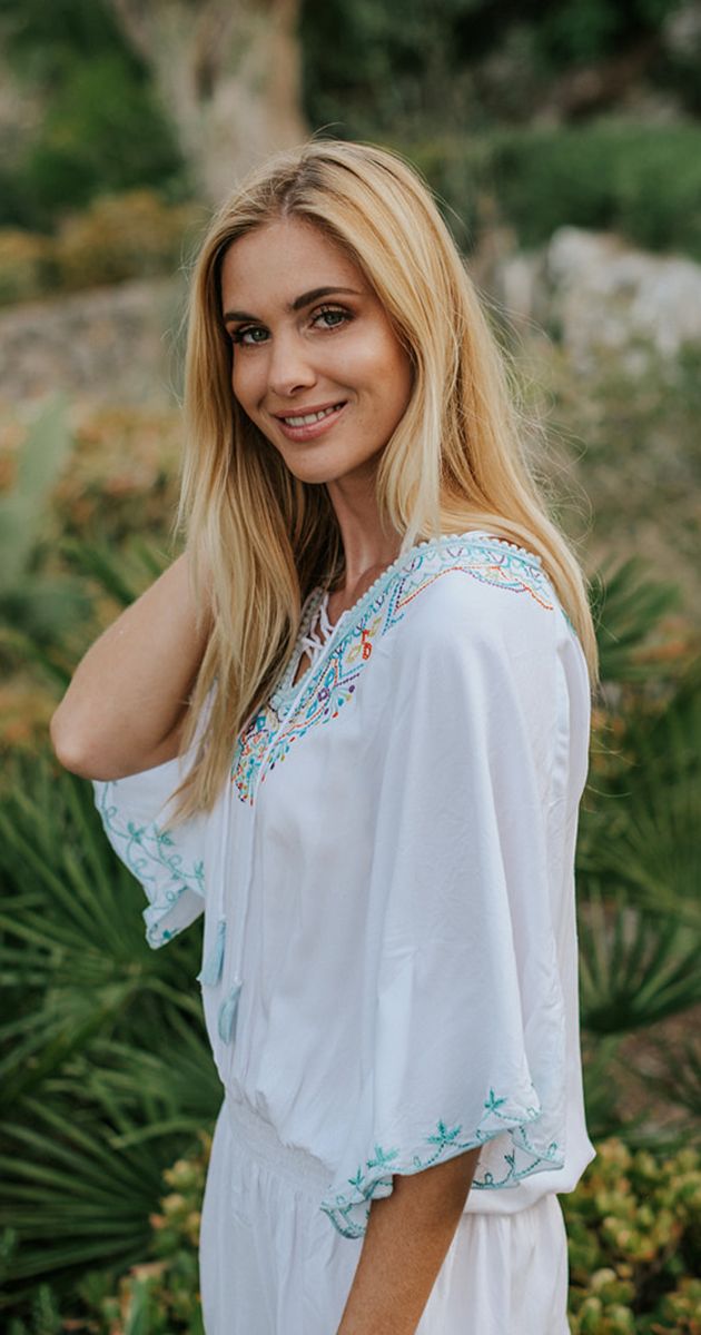 Blusa Dahlia, la prenda perfecta para el verano. Con un cuello en V abierto hacia atrás y hacia adelante, con intrincados bordados en el pecho y los hombros. Con una ligera influencia nativa americana, esta es una creación hermosa. Se puede usar como blusa o simplemente como un vestido corto perfecto para la playa. Hecho de rayón súper suave, este vestido hará que sea muy fácil empacar para tus vacaciones.