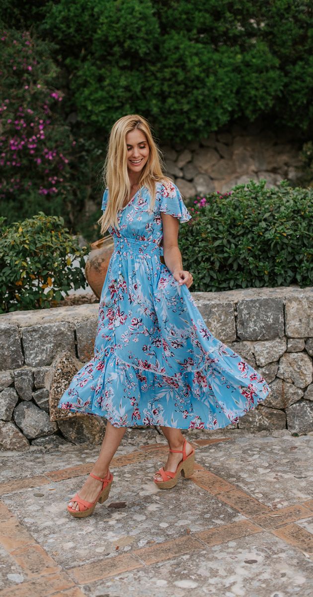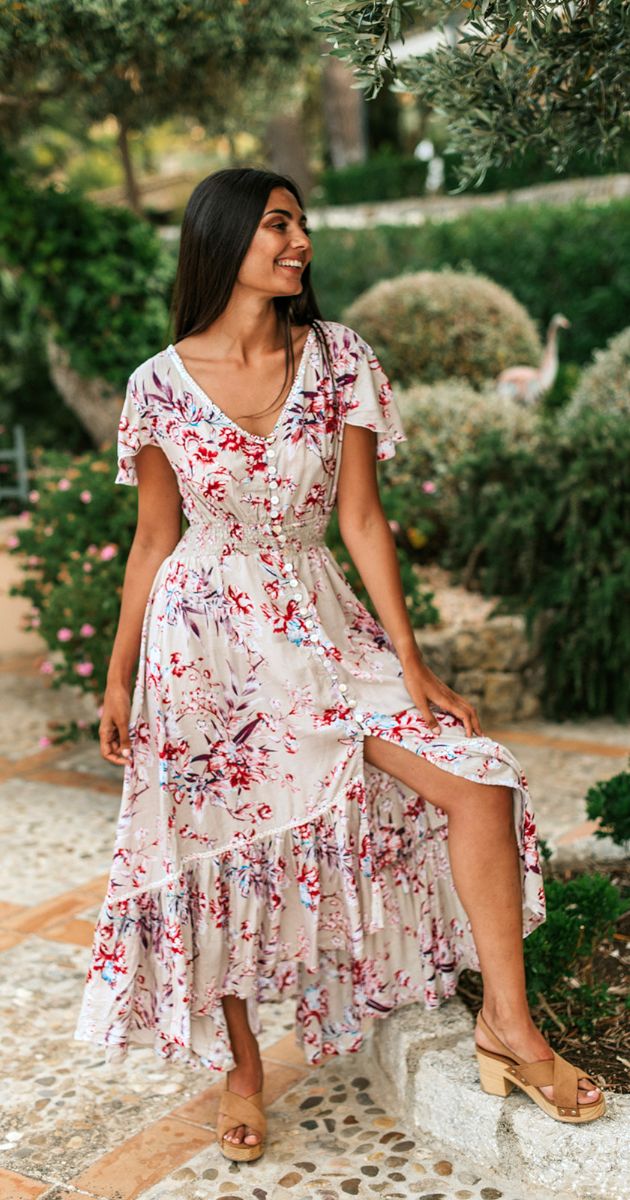 El coqueto Vestido Hestia maxi tiene un corte hermoso y la misma tela de flores silvestres del vestido largo de Hera. En cambio, tiene un frente completamente abotonado hasta la rodilla, una espalda abierta con dos tiras, un dobladillo con volados y mangas cortas de raglán. Está ligeramente recogido alrededor de la espalda baja, para garantizar el ajuste perfecto para cualquier forma del cuerpo.