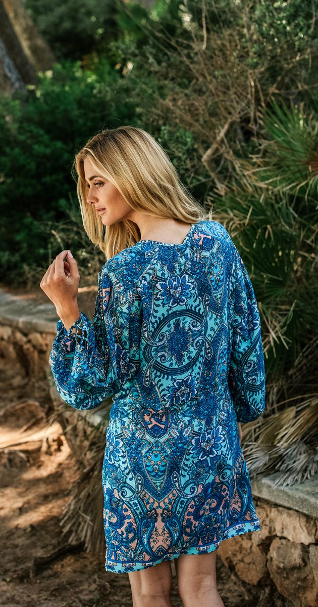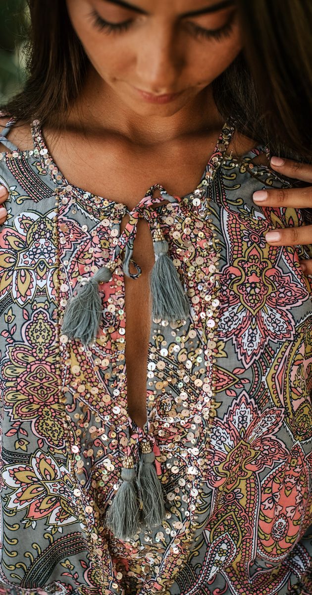 Esta increíble túnica Meredith corta es otra hermosa pieza de nuestra colección de diseñadores. Tiene el mismo patrón que la versión batik pintada a mano como la túnica Leda, pero esta línea viene con un estampado de mandala en 3 colores distintos. Con mangas trenzadas, adornadas con hermosas cuentas de escamas de pescado a lo largo del cuello y el pecho. Ajustable con un fino cordón en la parte delantera para revelar tanto ... o tan poco escote como se desee.
