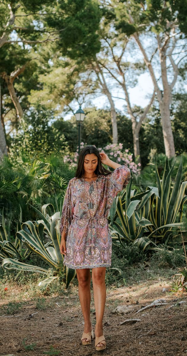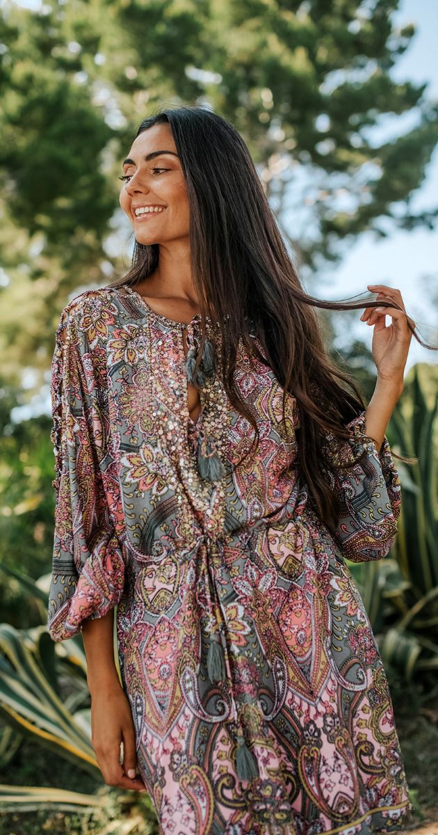 Un homenaje a las psicodélicas chicas boho de Ibiza de los 70, este vestido se convertirá rápidamente en el centro de cualquier fiesta este verano.