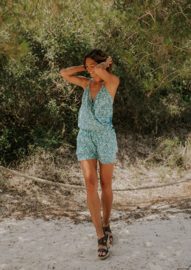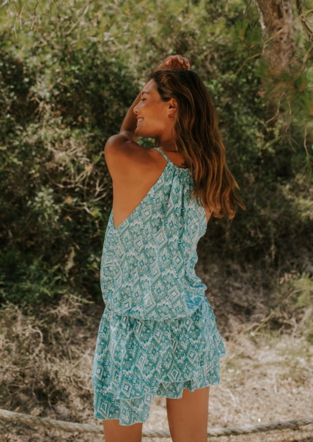 La túnica korta Amber se compone de un estampado de prisma étnico. Se presenta en verde, azul o gris con bonitos adornos manuales alrededor de la espalda, cintas en los hombros y en su parte delantera plegada hasta la cadera. Su graciosa y pequeña falda de doble pliegue le da un estilo juguetón y juvenil. Crea estilo sin mucho esfuerzo con un par de sandalias, zapatos de cuña o tal vez con un cinturón alrededor de la cintura.