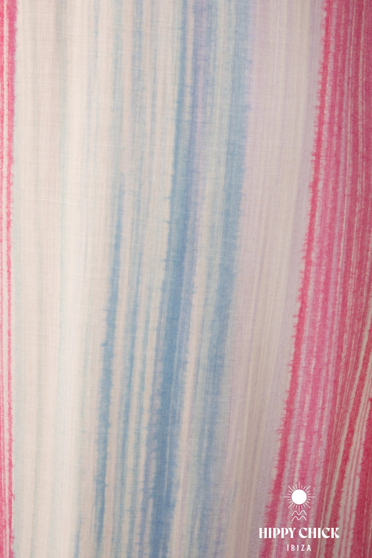Featuring a unique stripes batik pattern, the Brielle Duster adds a touch of eclectic flair to any outfit. Its flowing silhouette and draped design create a sense of movement and fluidity. Available in Pink and Turquoise.