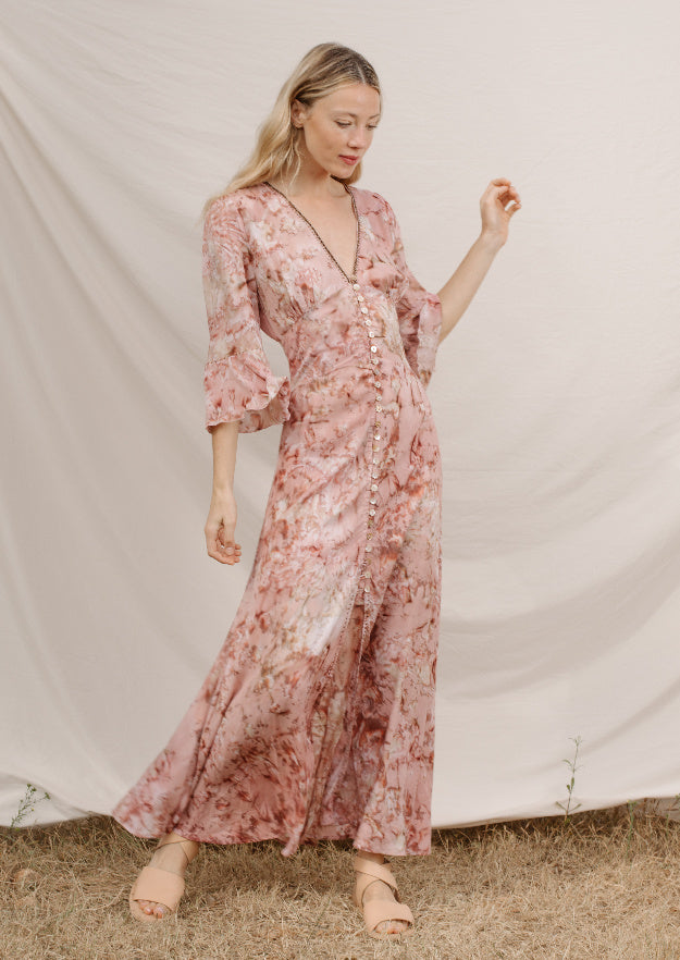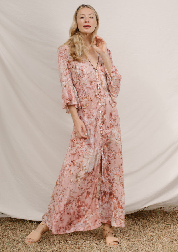 Introducing our exquisite Madison Dress in the Geode Tie Dye pattern, a true embodiment of bohemian style with a touch of modern elegance. This dress features a captivating V-neck design, adding a hint of allure to its boho charm.