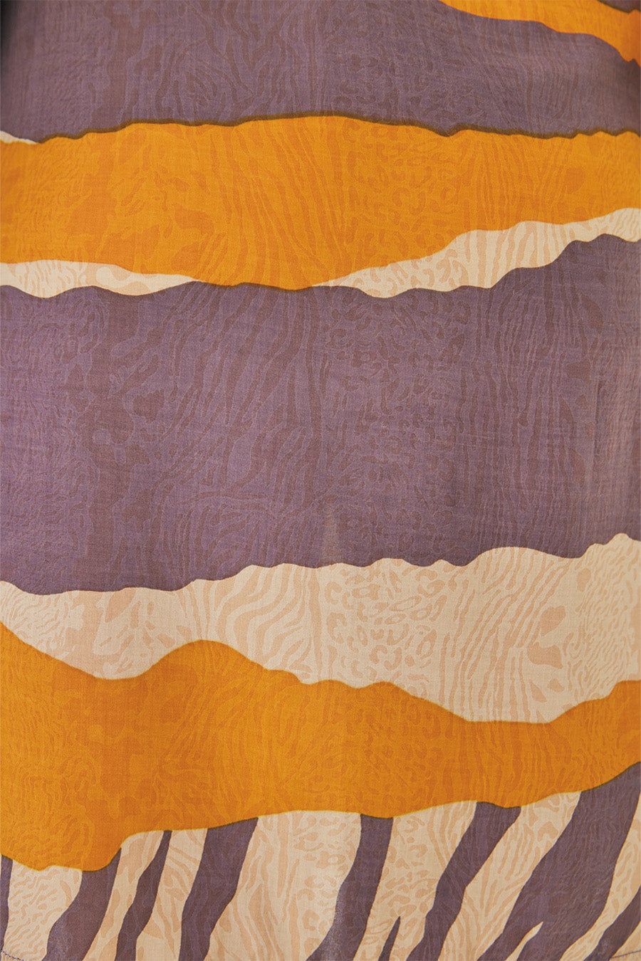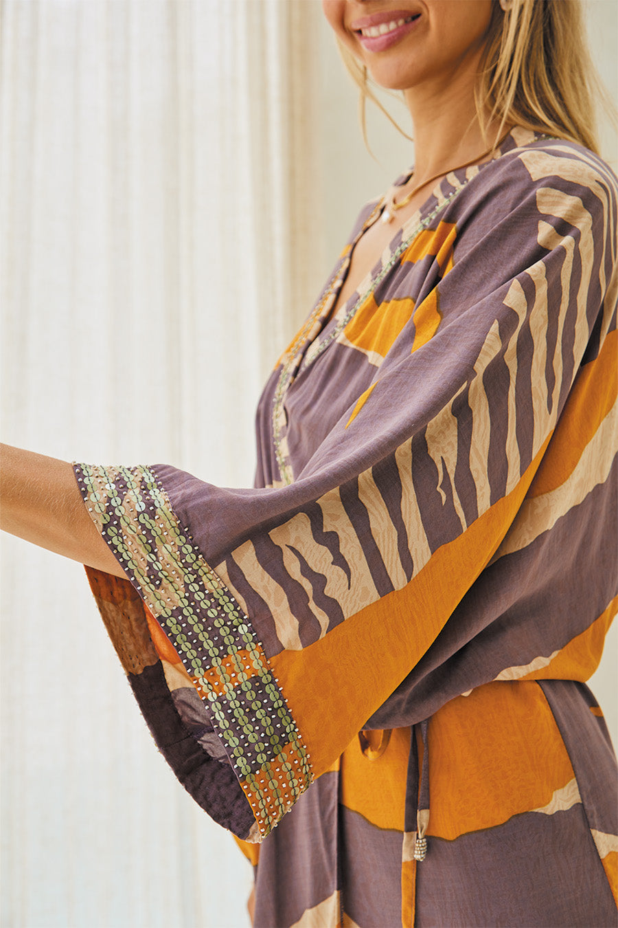 The Odyssey Kimono Top blends tribal edge with effortless flow. Featuring wide sleeves and an open cut, it’s available in Urban Zafari: warm brown with golden accents.