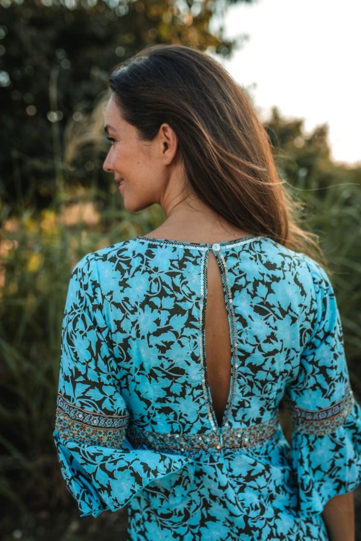 Avec des manches d'ange gracieuses et de magnifiques perles embellies à la main le long de la poitrine offrant une sophistication subtile. Choisissez parmi deux magnifiques tons de bleu ou de gris, dans notre superbe imprimé Soft Flowers.