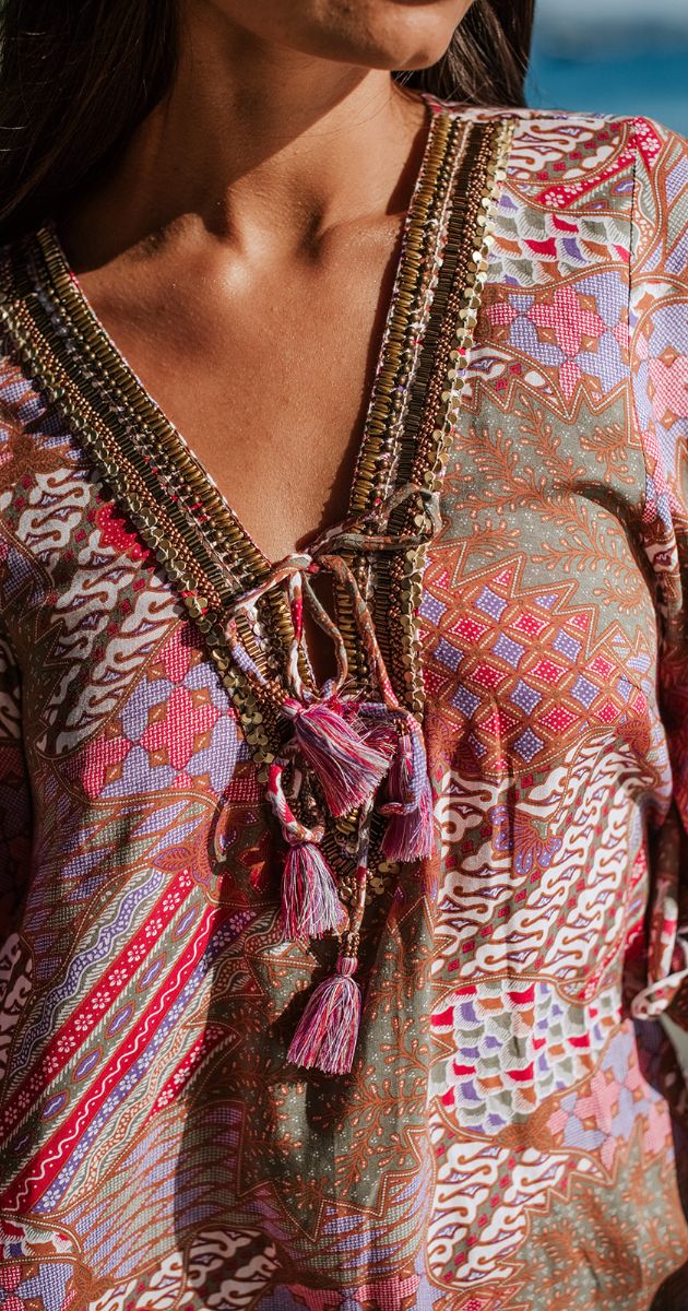 Ammirate il Tunique corto Diana in una speciale stampa etnica con molti motivi diversi.