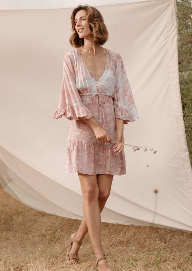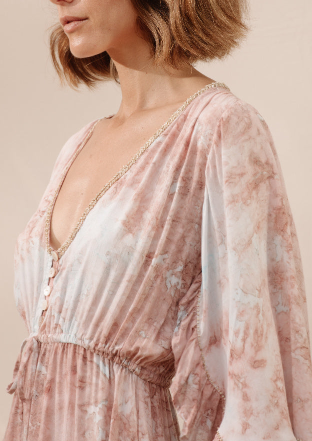 The Jules Tunique is a summer beach classic. Features high Mediterranean vibes with hand-embellished beading along the deep V-neck line, offering intricate elegance. This edition is made from ultra-soft Rayon This design has large baggy sleeves and it´s amazingly detailed, with buttons on the chest area. It can be worn buttoned or unbuttoned.