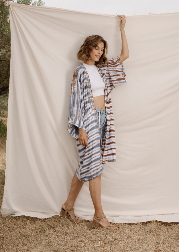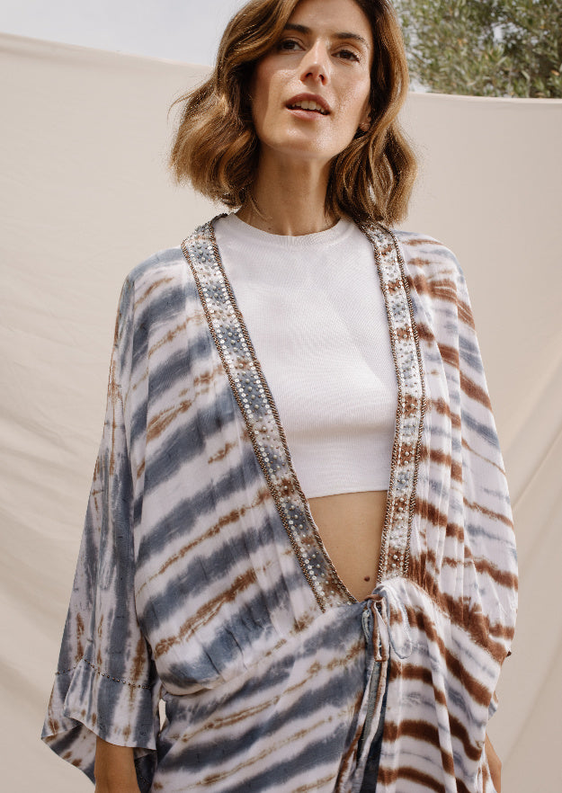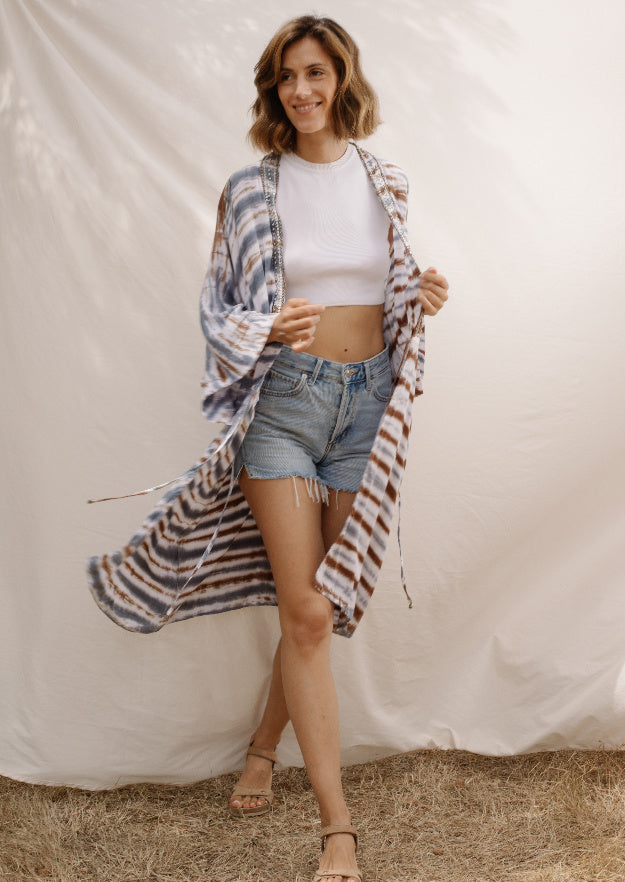 Wear the Charo Kimono with shorts, in order to draw attention to your figure. Also, its horizontal blue, white, and brown stripes suits great with light-colored clothing. A very delicate garment made from ultra-soft Rayon, with divine hand-embellished beading.